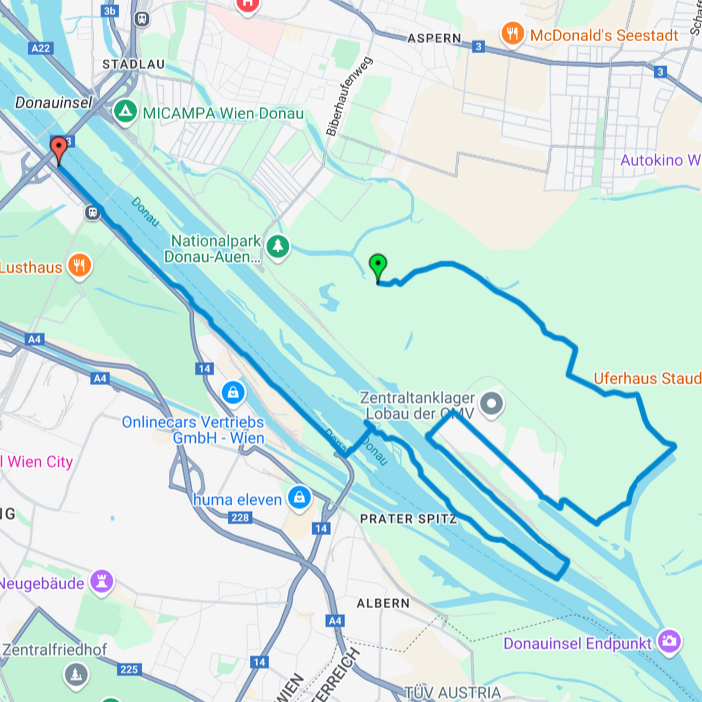 Die dritte Etappe der Pista Viennista führt dich in den Osten Wiens. Auf 19 Kilometern erwarten dich nicht nur kurze, knackige Gravel-Passagen durch die Lobau sondern auch flotte Einblicke in den gelebten Freikörperkult an Wiens Stränden. Abgeschlossen wird die Runde (nach einer Überfahrt des Kraftwerks Freudenau) bei einem andachtsvollen Zielsprint zwischen Friedenspagode und Praterbrücke. Die gewählte Strecke ist mit Rennrädern definitiv befahrbar, technisch anspruchsvolle Details dürfen aber gerne erwartet werden.